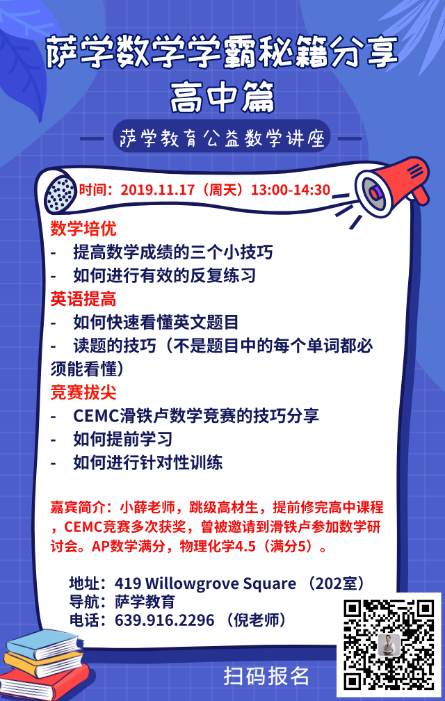 地点:419 Willowgrove Square /谷歌导航:萨学教育