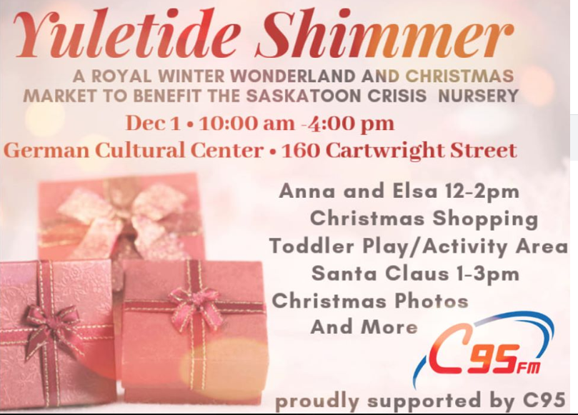 请参加12月1日在萨斯卡通的德国文化中心举行的第二届年度Yuletide Shimmer!该活动是萨斯卡通Crisis Nursery的筹款活动,并得到C95 FM的大力支持。我们将在这个假期里为住在萨斯卡通Crisis Nursery的孩子们募集捐款和新的圣诞节礼物。