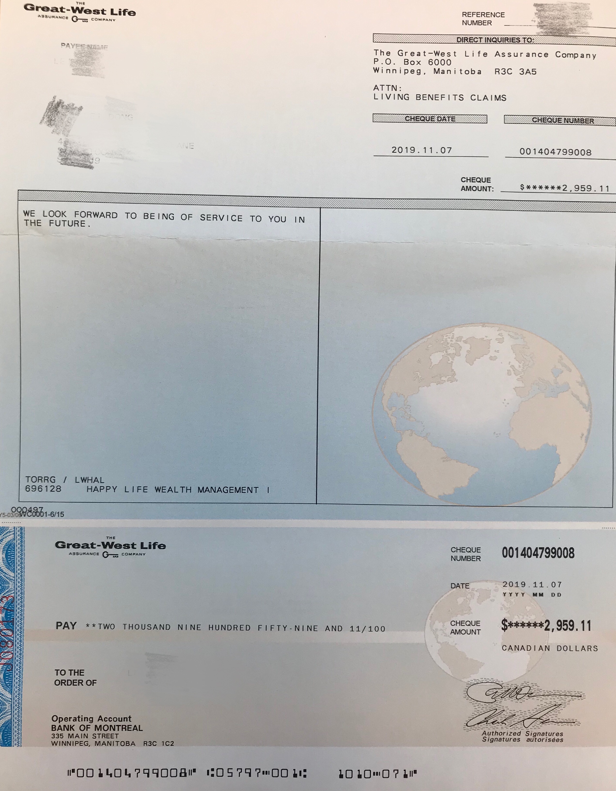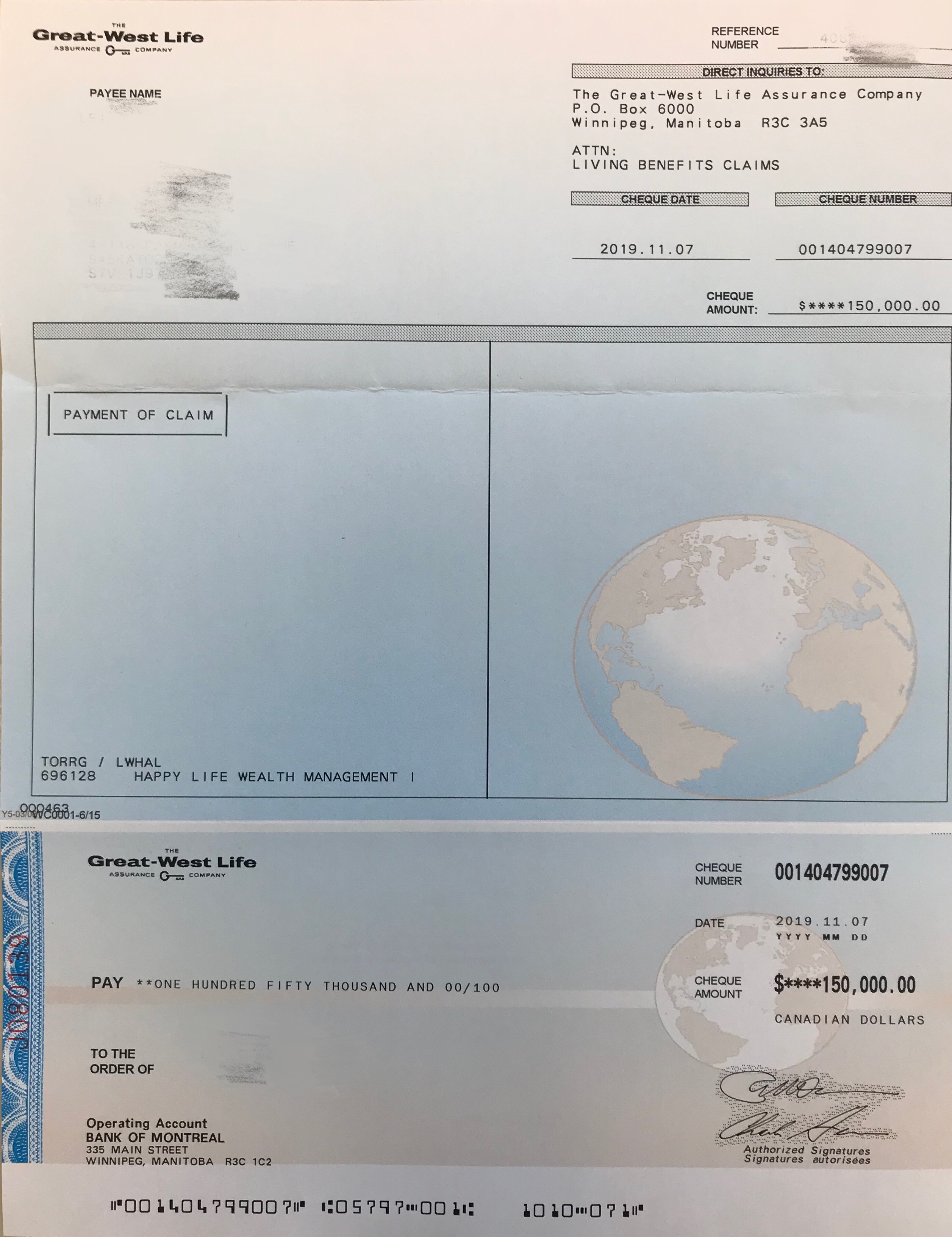 11月20日,W在萨省的家中收到了两张支票,一张15万,一张$2959。W对我表示感谢,我说这是应该的,如果一定要谢,就感谢你自己当初做了这个正确的决定,并且在旁人质疑的时候没有动摇。这个问题其实很简单,如果有人劝你不要买保险,只需要反问一句:我出问题的时候,你出钱吗?