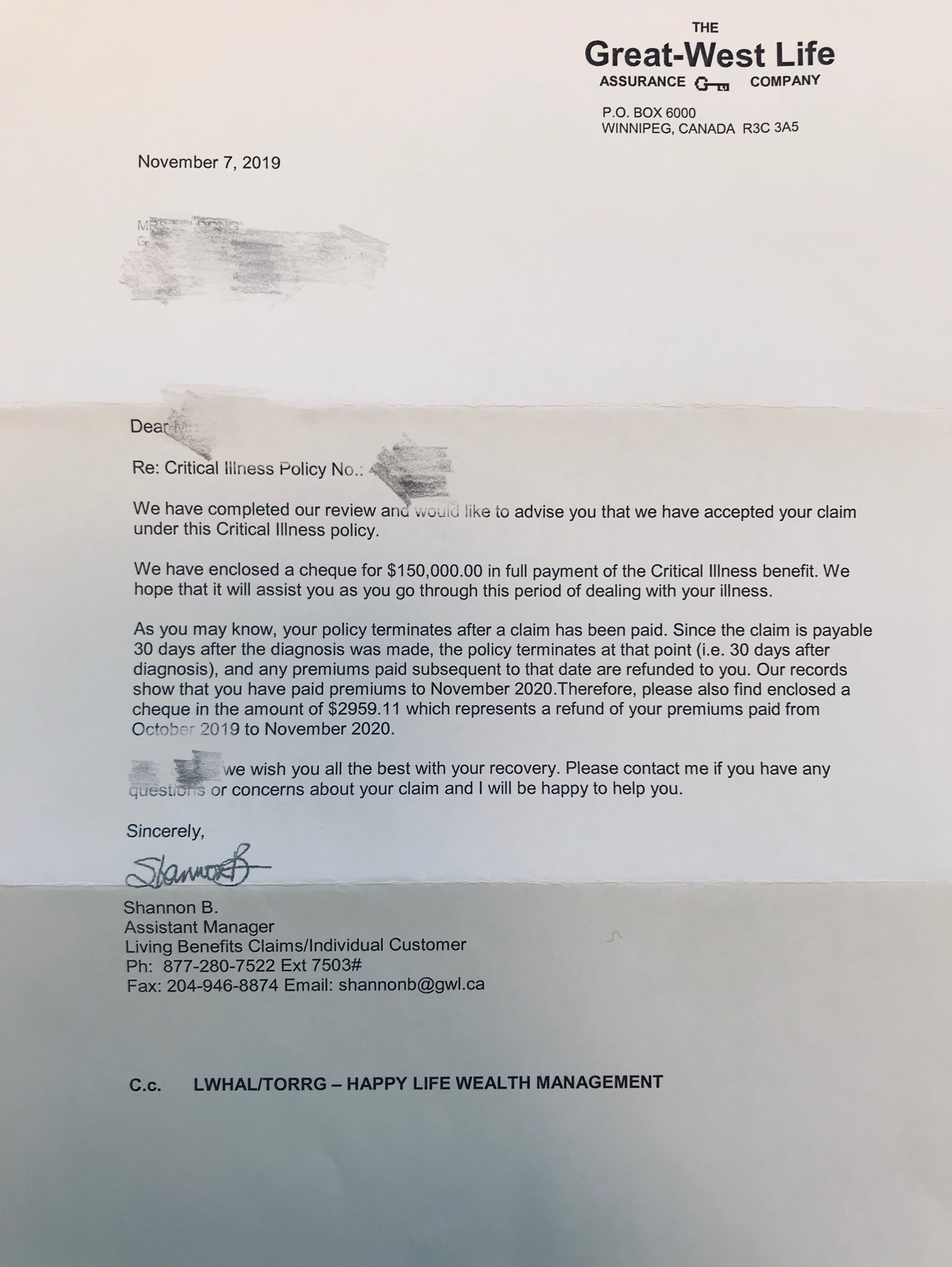 两周后我收到了W的信息,她说在国内的手术做得非常成功,她准备稍后回加拿大进行术后康复。我说太好了,同时让她把所有与诊断和治疗相关的报告收集好后寄给我,然后连同她填写好并签过字的理赔申请表一起递交给 Great West Life。此外,我提醒她,她的危疾保险第三年缴费时间是今年11月中,为了双保险,建议她在办理理赔的同时,把新的一年的保费先缴了。