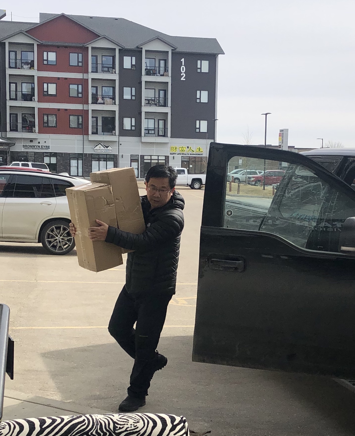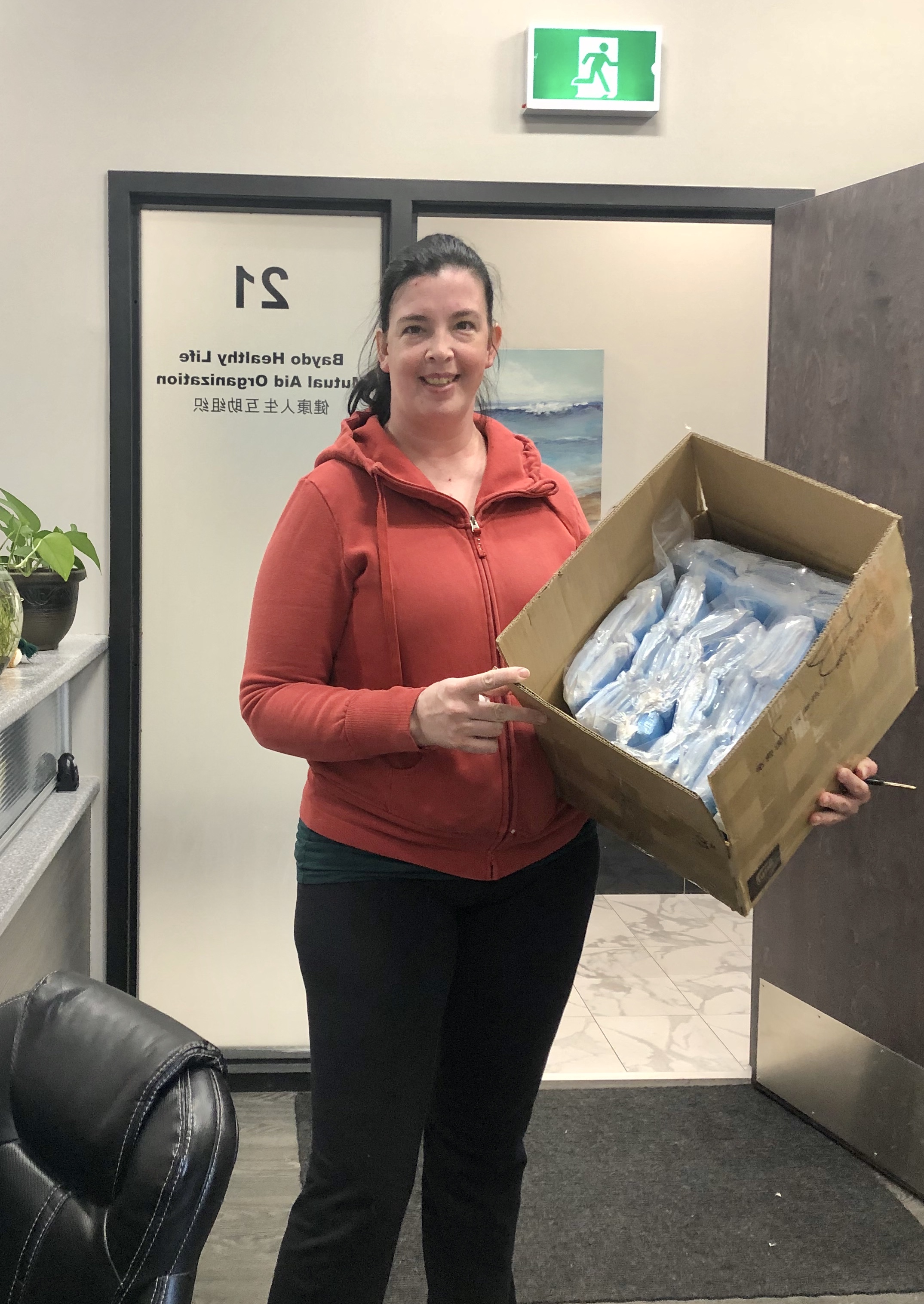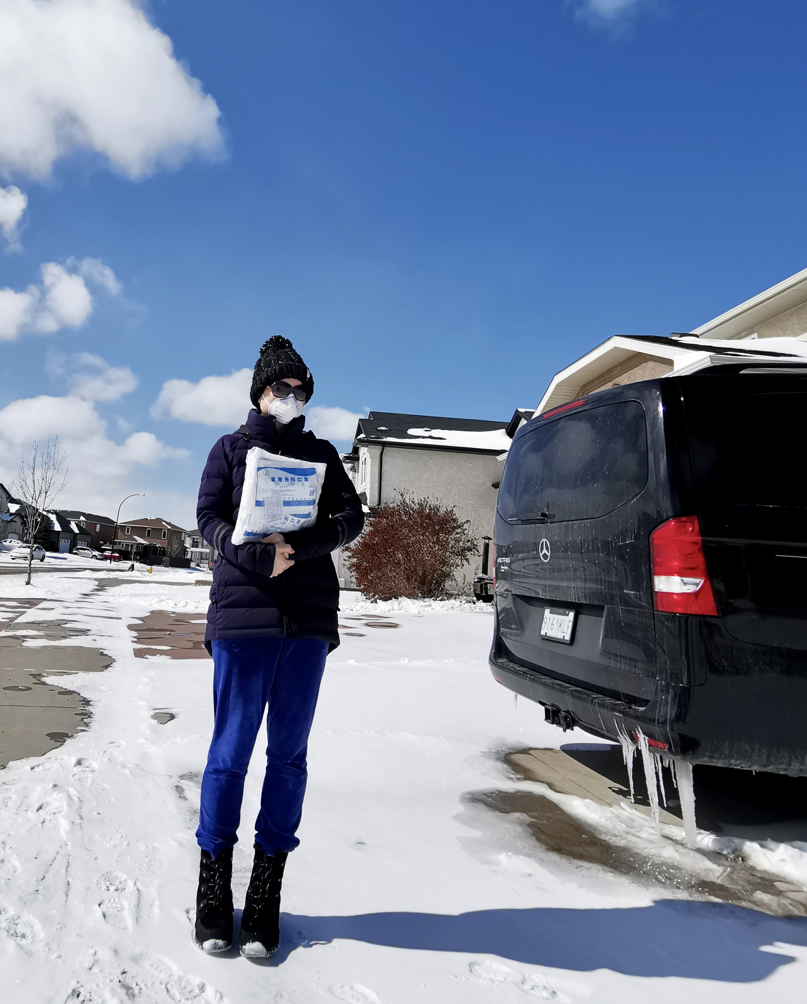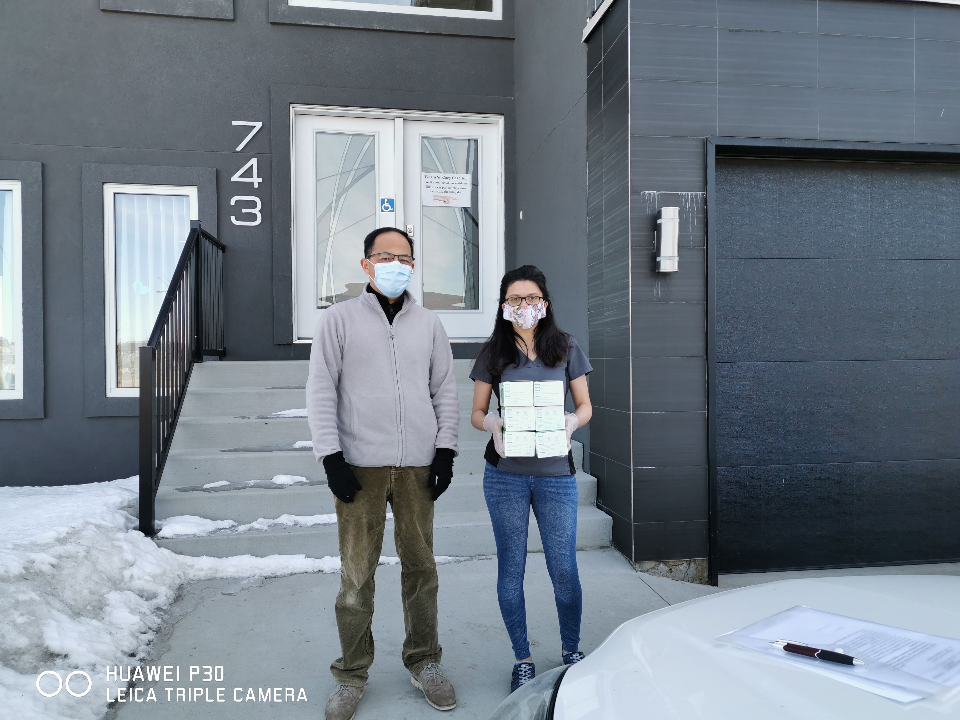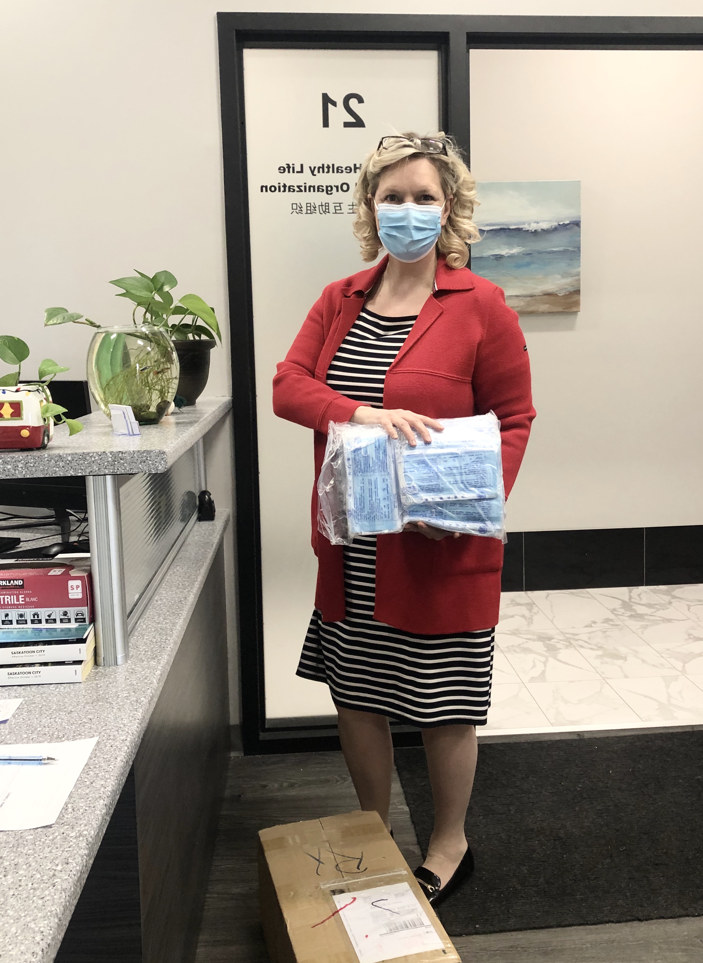 18、4月12日,再次捐助萨斯卡通Open Door医用口罩300个,工作人员郭蓉女士前来领取 :