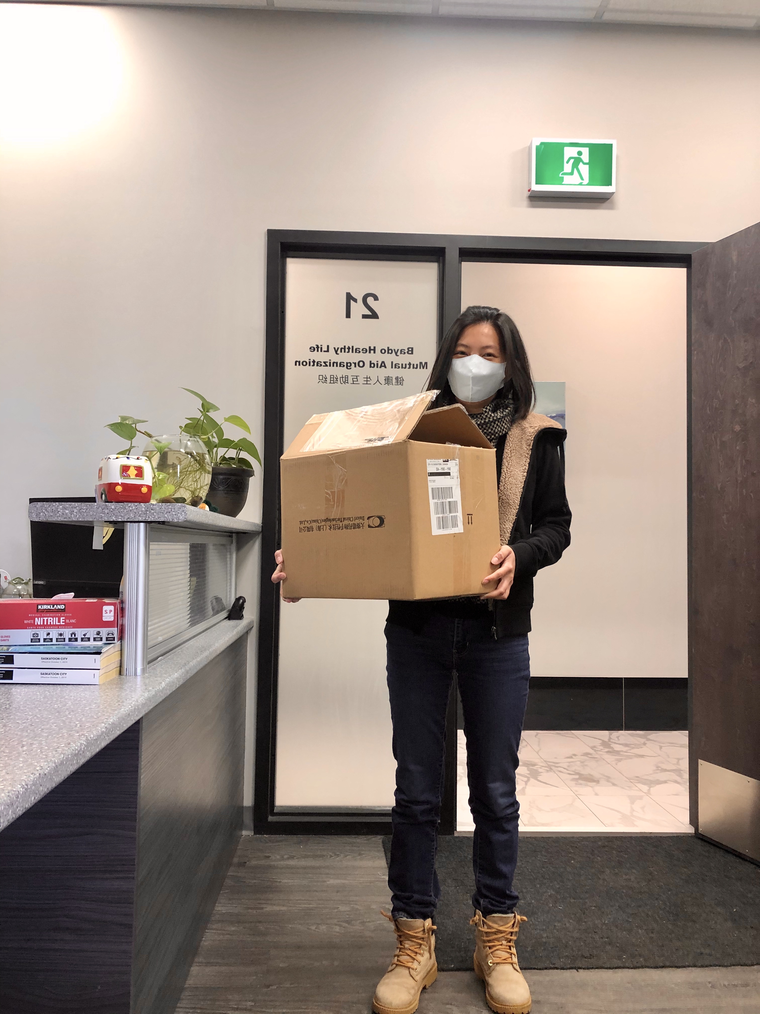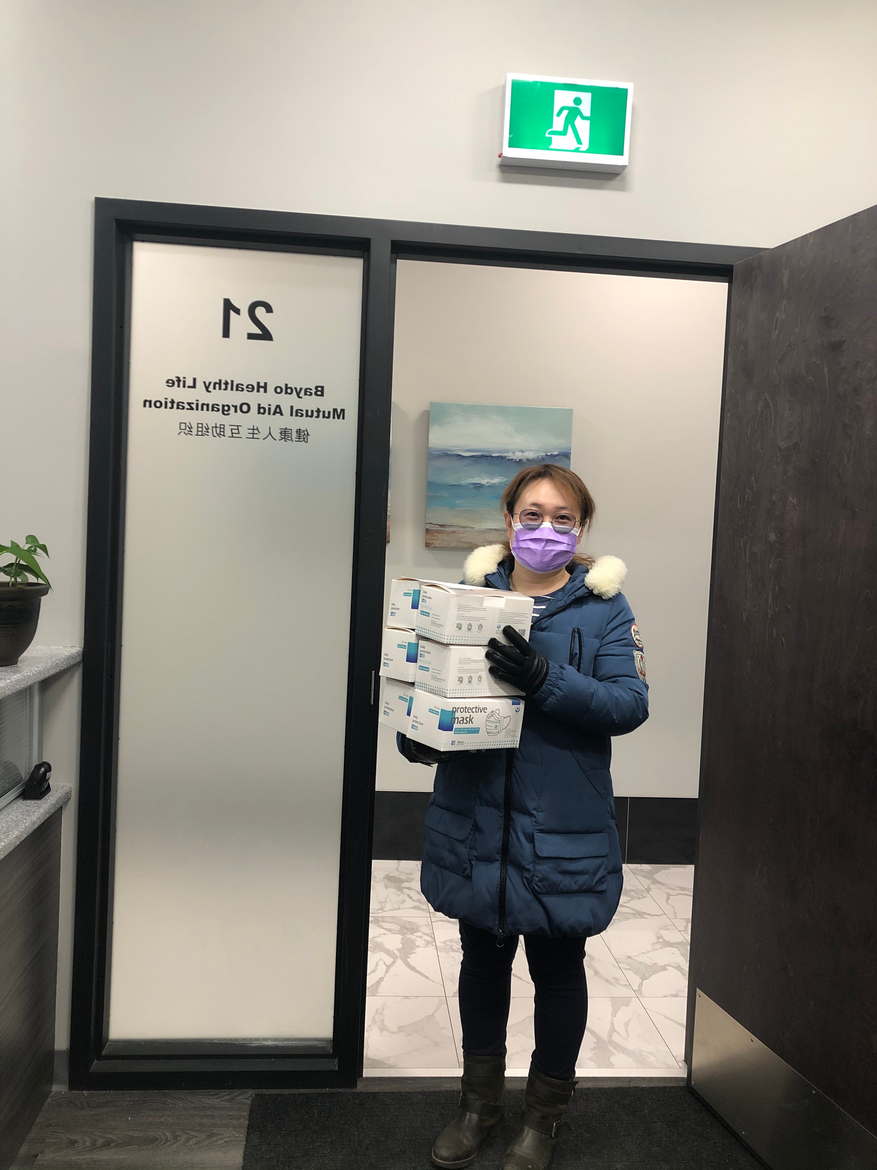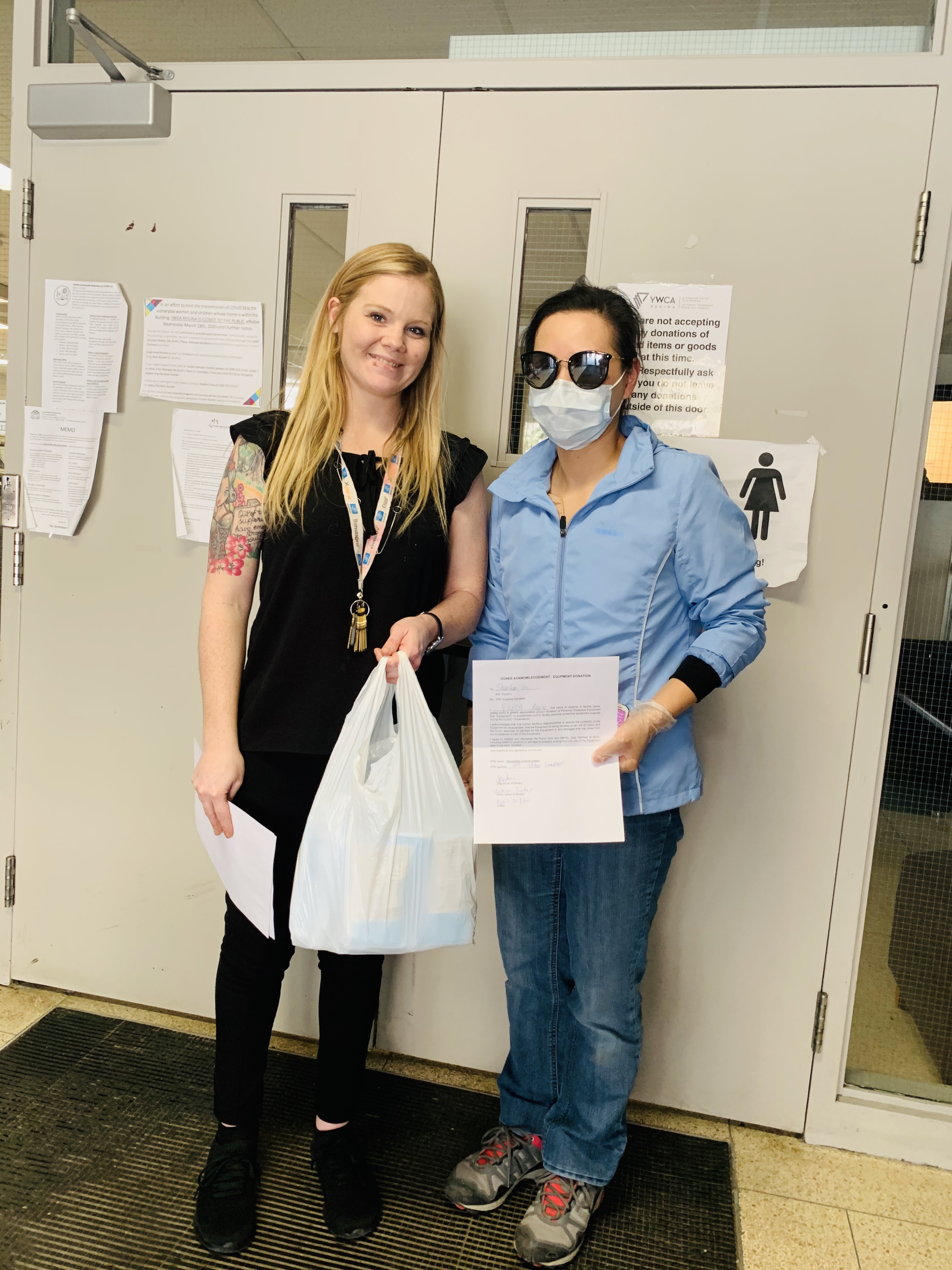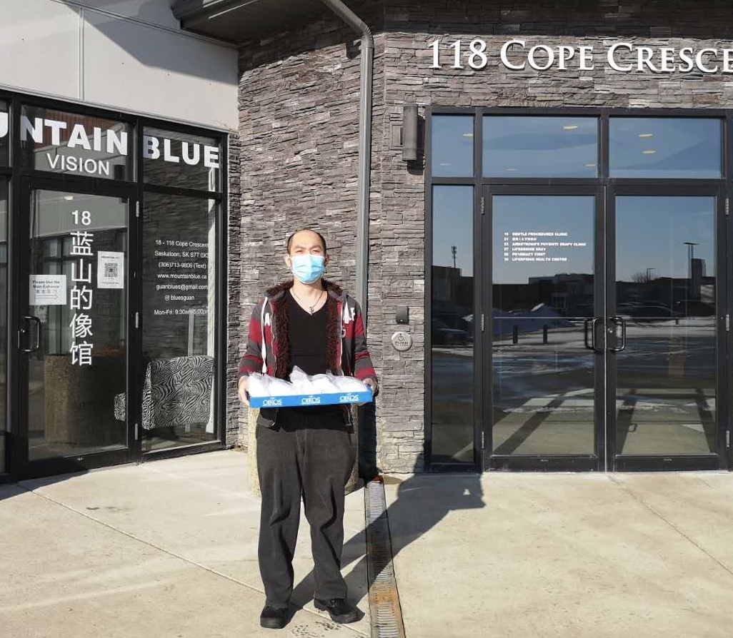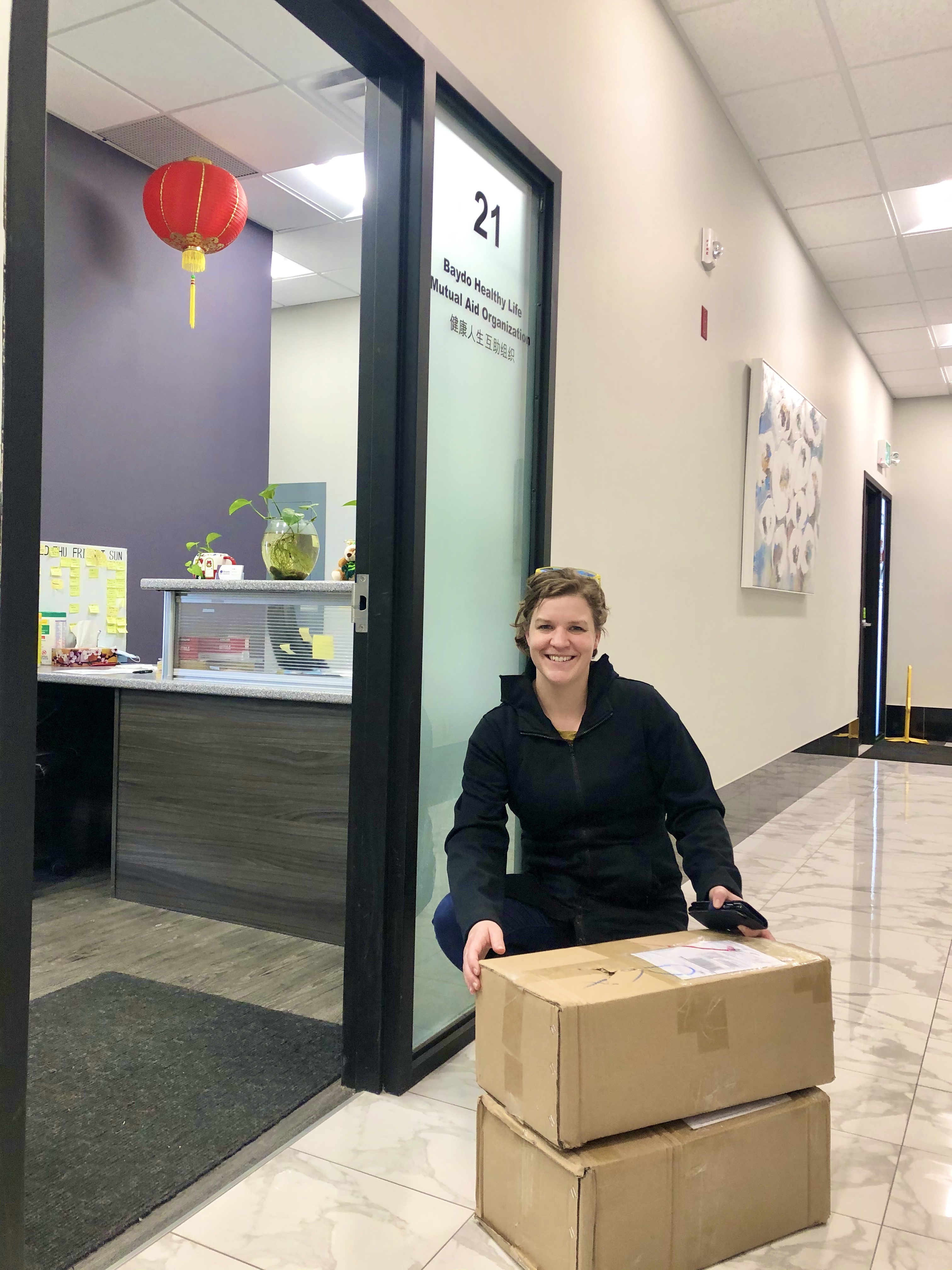 18、4月12日,再次捐助萨斯卡通Open Door医用口罩300个,工作人员郭蓉女士前来领取 :