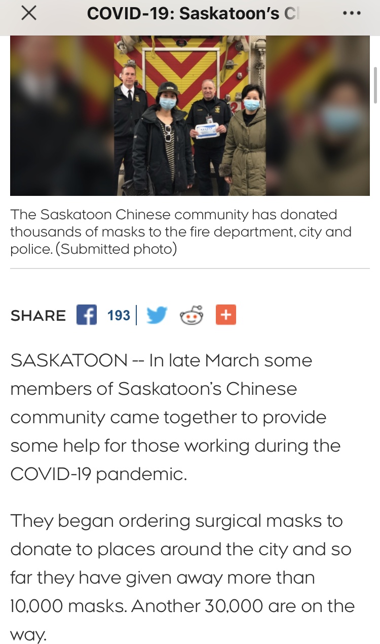 截止今天,我们已向萨斯卡通63个、其他城市和地区约42个医疗部门和维持城市运转的单位共计捐助了62350个口罩、950双一次性手套和4支额温枪(含已援助里贾那华人社团捐助当地的10000个)。