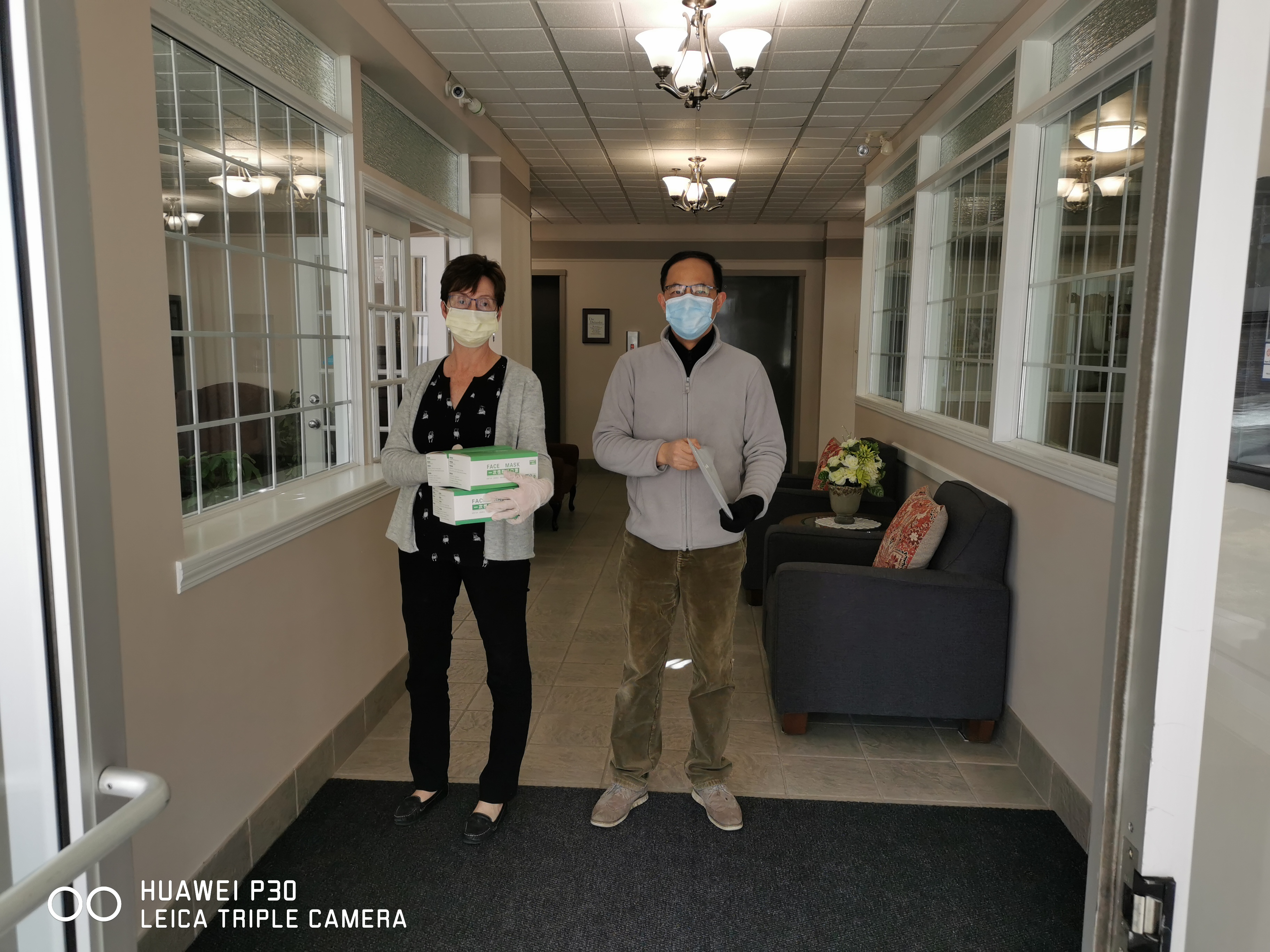 8、4月6日捐助Extendicare Special Care Home(老人院)防护口罩250个,由负责人Michael接收: