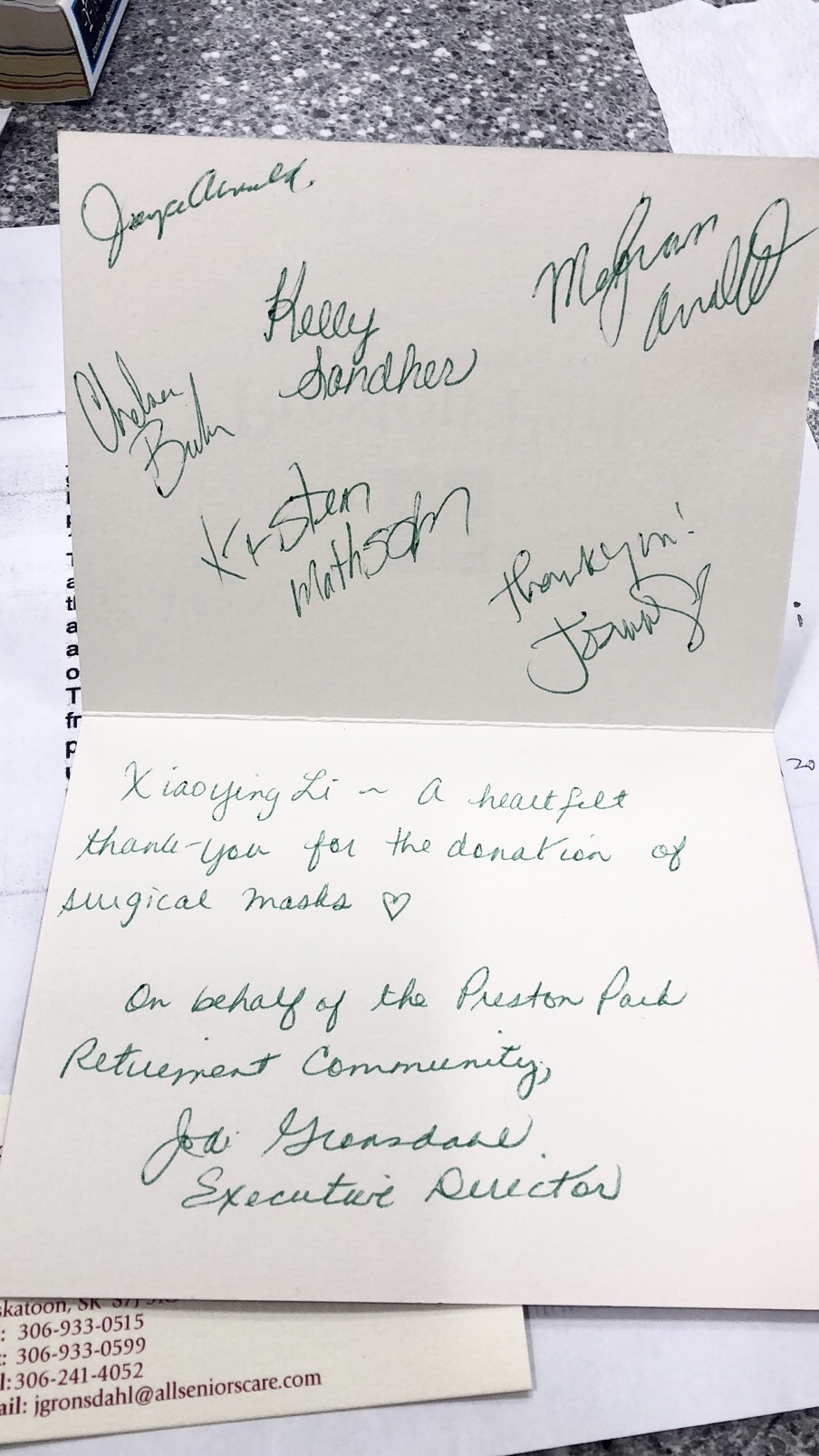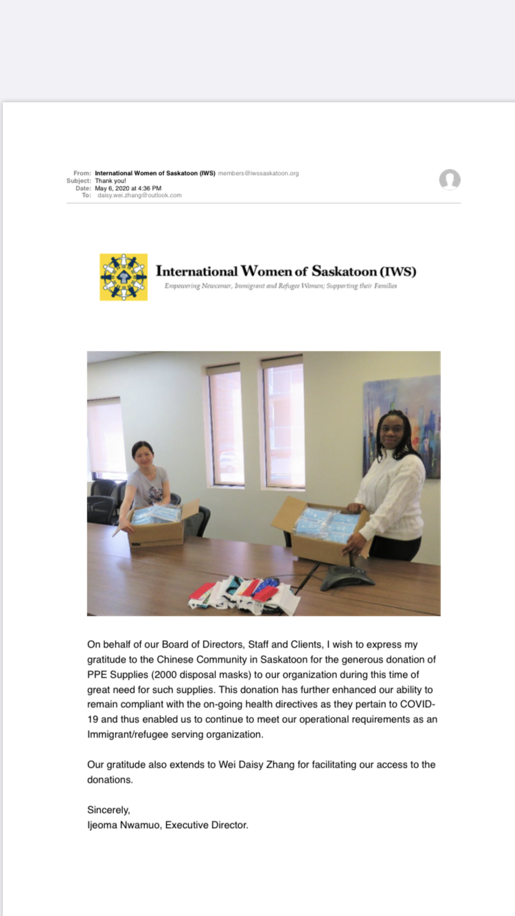 48、4月25日经志愿者“小花”联络捐助International Women of Saskatoon (IWS)萨斯卡通国际妇女协会防护口罩2000个,并收到了感谢信: