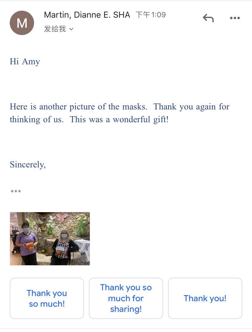 47、4月24日捐助Sherbrook community Center养老院防护口罩1000个,由Renee Kwithoski女士领取: