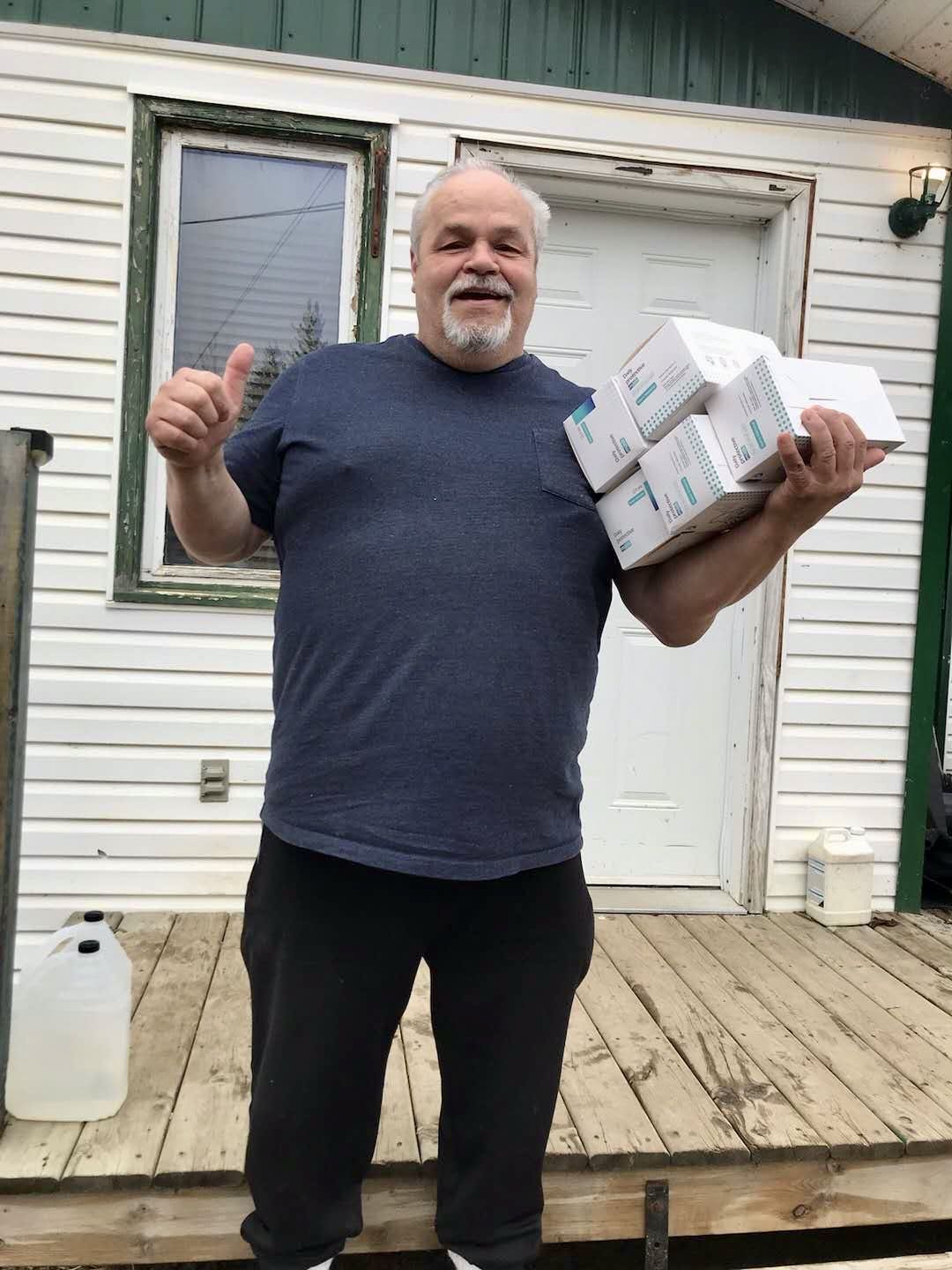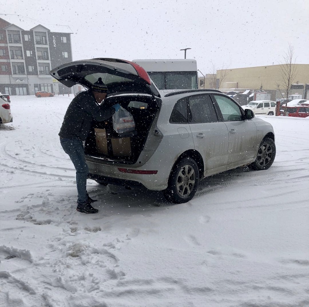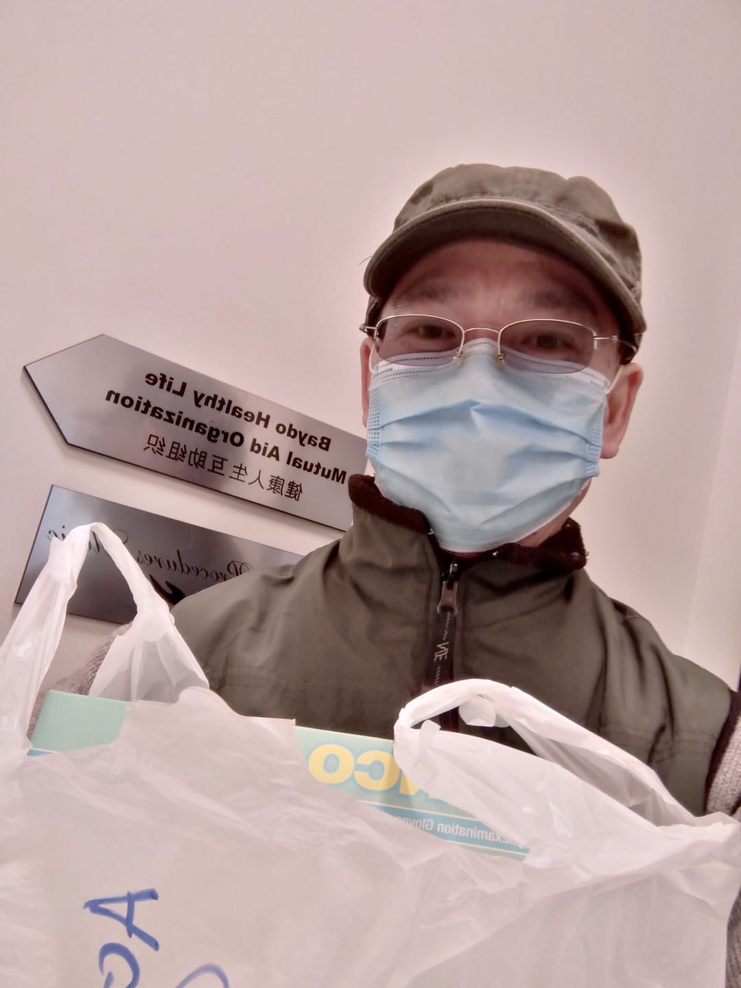 7、4月6日捐助Royal University Hospital(萨大医院)急诊部外科口罩400个、医用口罩100个。Dr. Roger Bristol医生为避免我们志愿者去医院发生不必要的接触,亲自顶风冒雪来公益组织办公室领取物资: