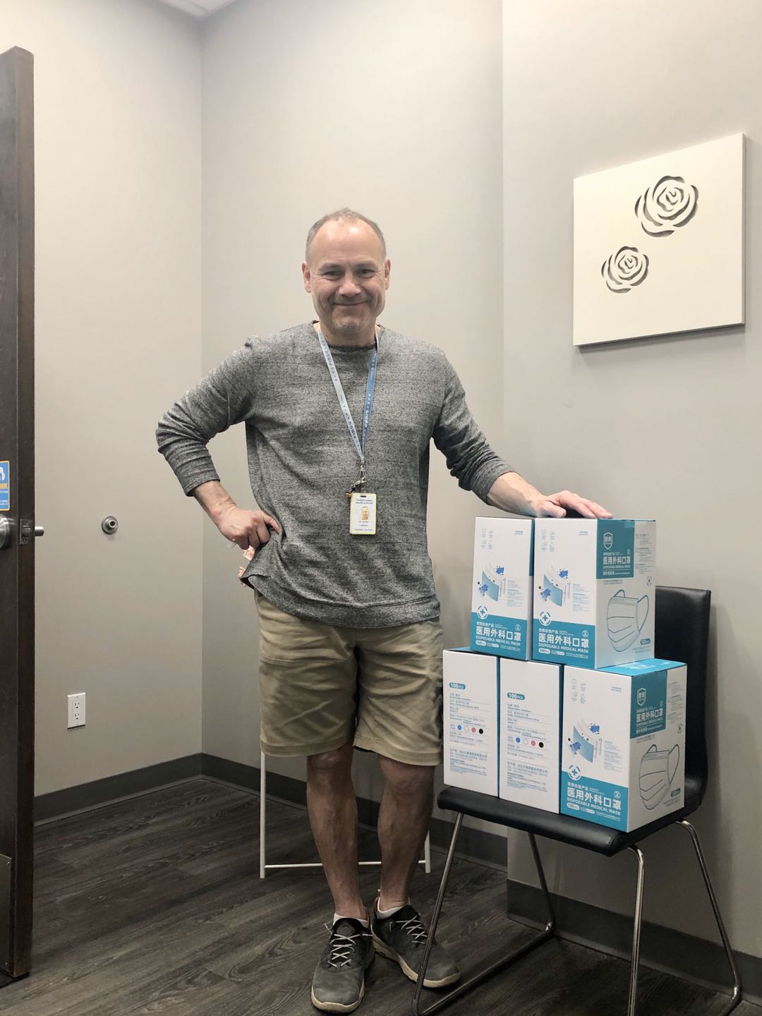 61、5月12日捐助萨斯卡通外科医生协会(Saskatoon General Surgery Consultants (SGSC) group)外科口罩500个,由Dr.Jeff Gaboury前来领取:
