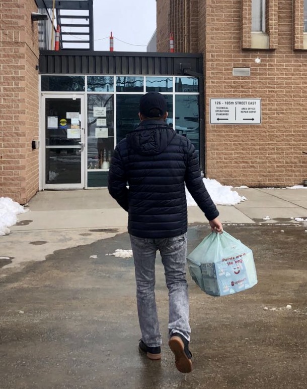 14、4月9日,捐助萨斯卡通Open Door医用口罩100个,工作人员Harjeet前来领取(宗教原因照片略)。
