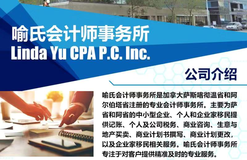 喻氏会计师事务所是萨省注册的专业会计师事务所。主要为萨省和阿省的中小型企业、个人和企业家移民提供记账、个人及公司税务、商业管理咨询,生意与地产购买,商业计划书撰写,商业计划更改,企业家移民解除条件等服务。喻氏会计师事务所专注于对客户提供精准及时的专业服务。