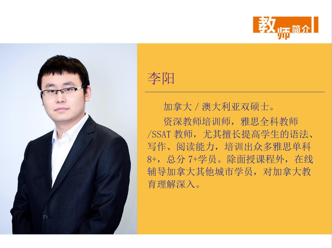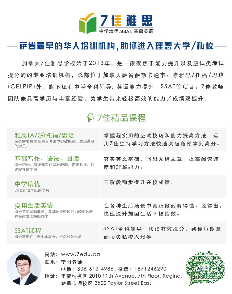 李阳老师,7佳雅思学校创办人。加拿大 / 澳大利亚双硕士。资深教师培训师,雅思全科教师/SSAT/小托福教师,擅长提高学生的语法、写作、阅读能力。除面授课程外, 网络学员遍及多伦多,温哥华,卡尔加里。