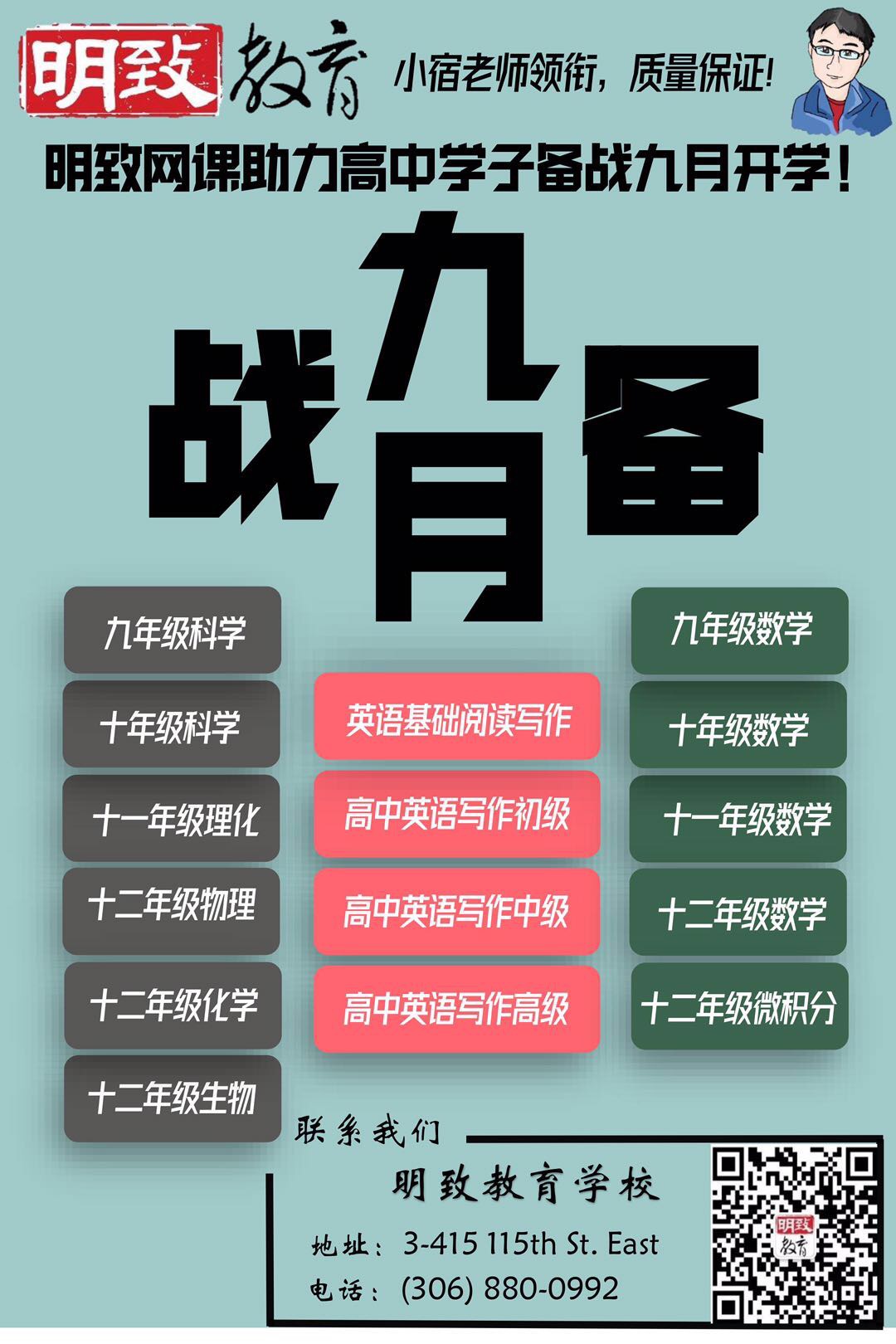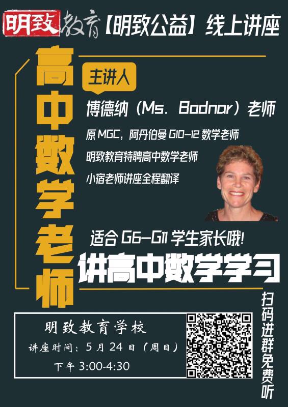 【明致公益】高中数学老师讲高中数学学习 随着疫情和这个特别的学期行将结束,萨屯的学子们是否为九月的新学期做好准备了呢?您希望多了解本地高中数学的学习方法,以便更好地帮助孩子提高成绩?您的孩子在高中觉得数学太简单,想跳级却不知道怎么办?您的孩子正在小学,想知道高中数学都学点儿啥?明致教育特请出萨省公校三十余年教学经验的老教师,原MGC/ 阿丹伯曼高中数学老师,明致教育特聘高中数学老师博德纳(Ms. Bodnar)老师为萨屯的小学/高中学子带来免费公益讲座:“高中数学老师讲高中数学学习”。讲座内容有: 1. 高中数学学点啥?高中数学学习内容介绍; 2. 高中数学怎么学?高中数学打分/学习方法介绍; 3. 啥是AP?数学AP面面观; 4. 小学生该怎么备战高中? 5. 疫情网课的数学学习。 讲座时间:5月24日(周日)下午3:00-4:30 讲座地点:Zoom在线平台 扫码加群就能免费听哦! (群二维码)