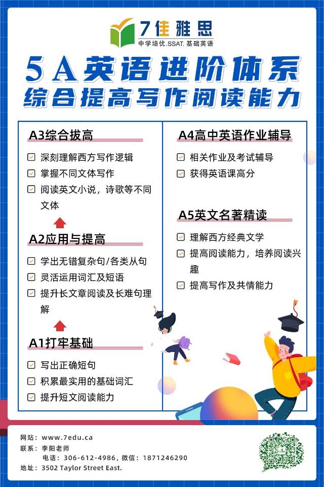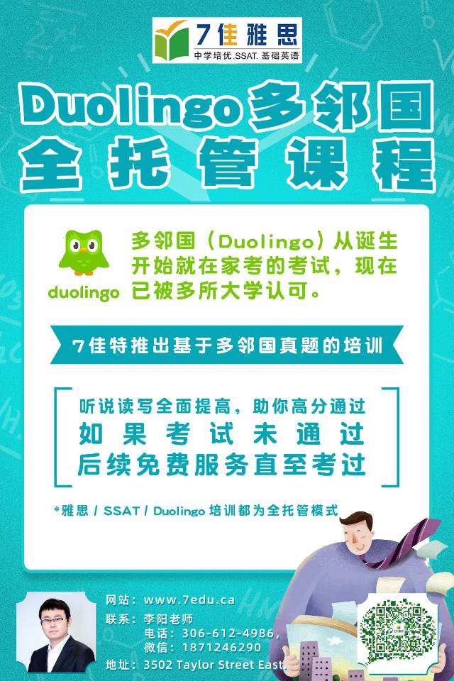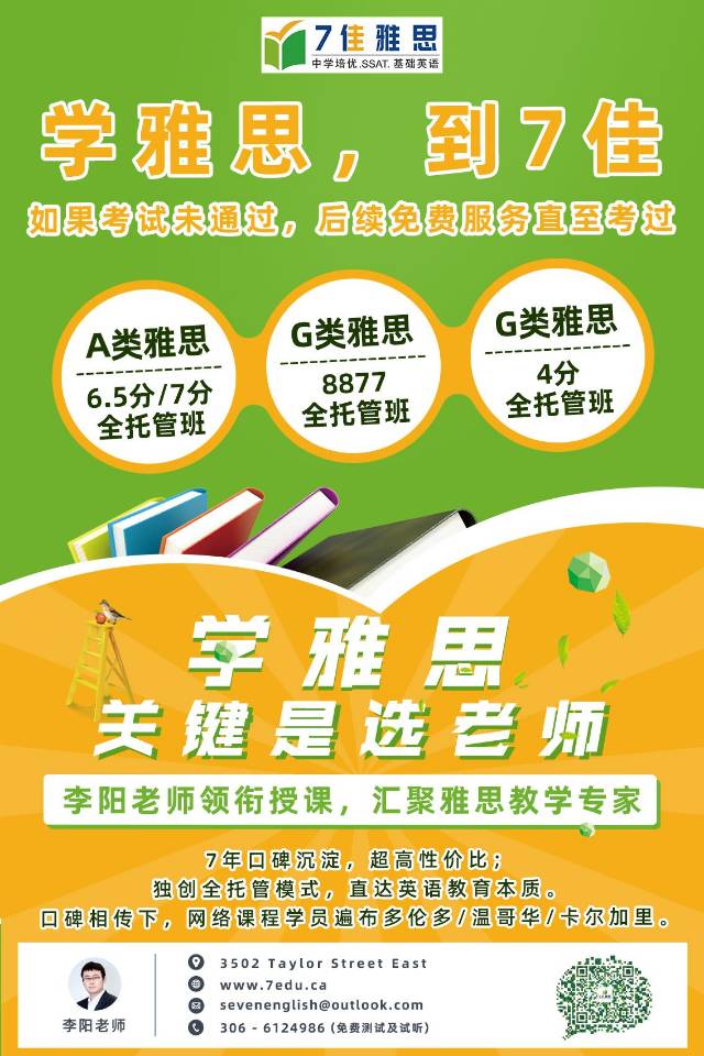【学英语,到7佳】7佳雅思学校暑假课程 🚩5A写作/阅读能力进阶 严密课程体系,超强中教+外教团队,覆盖5--12年级,7年口碑课程。 🚩高中英语ELA莎士比亚精讲 麦克白,哈姆雷特等高中英语必修,会中文的TESOL外教授课 🚩SSAT考试 “保姆式培训”助你攻克SSAT 🚩雅思考试 7佳“破圈”课程,吸引多伦多/温哥华/卡尔加里学员网络上课。李阳老师领衔授课。 🚩Duolingo多邻国 部分课程超值优惠,全部课程可先试听。疫情期zoom直播授课,试听微信1871246290,电话3066124986。 萨省最早的华人教培,7年专注英语能力提升。