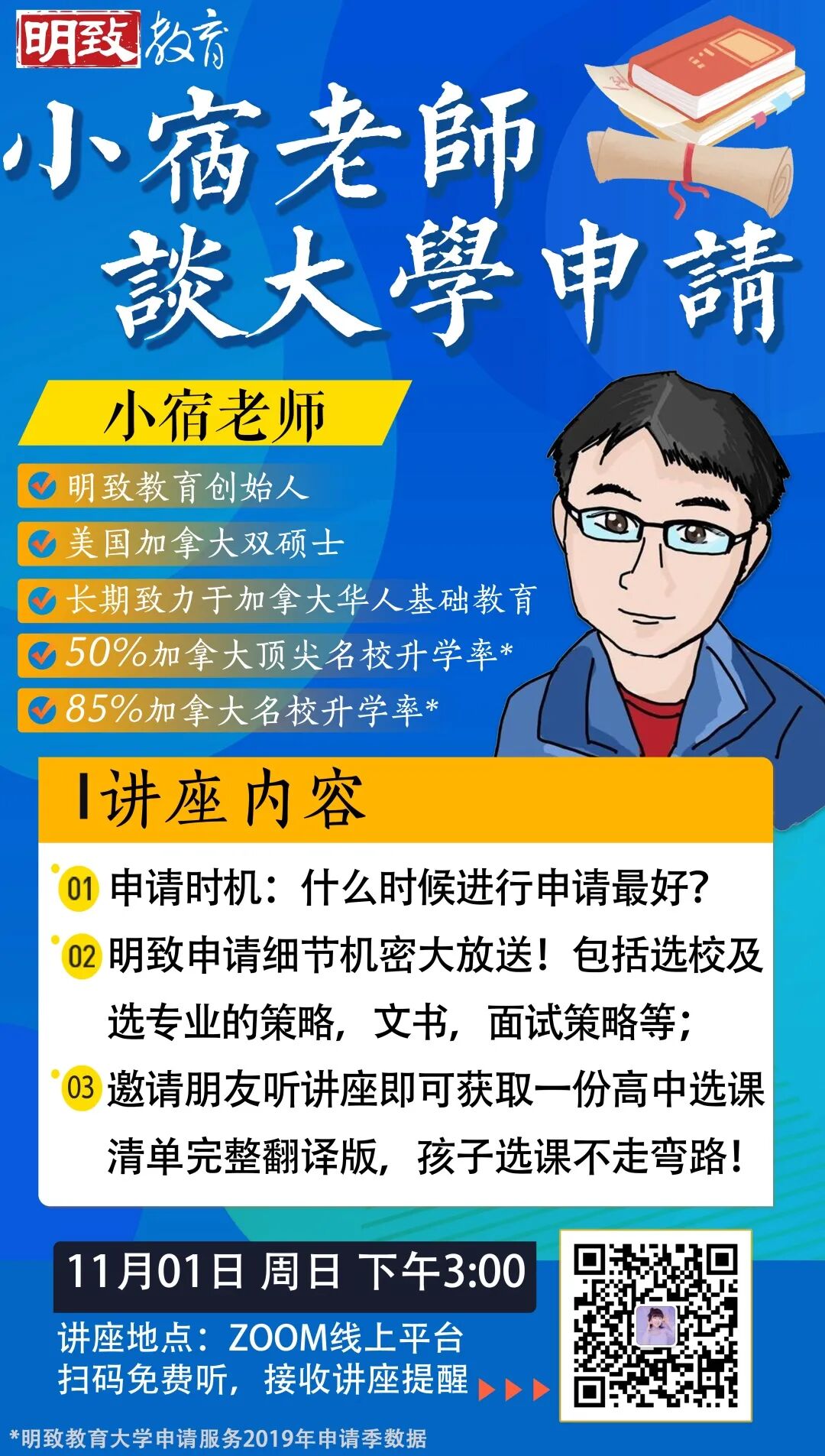 2020年的大学申请进入白热化,有的高三(十二年级)学子已经进入了大学申请的文书撰写的阶段,而有的学子还在观望选校,您的孩子到了哪个阶段呢?在本周日(11月1日),明致教育的小宿老师将为萨屯十一十二年级的高中学子和家长们拿出压箱底儿的绝活,分享申请大学的选校选专业和文书面试的多年经验!讲座内容有:
