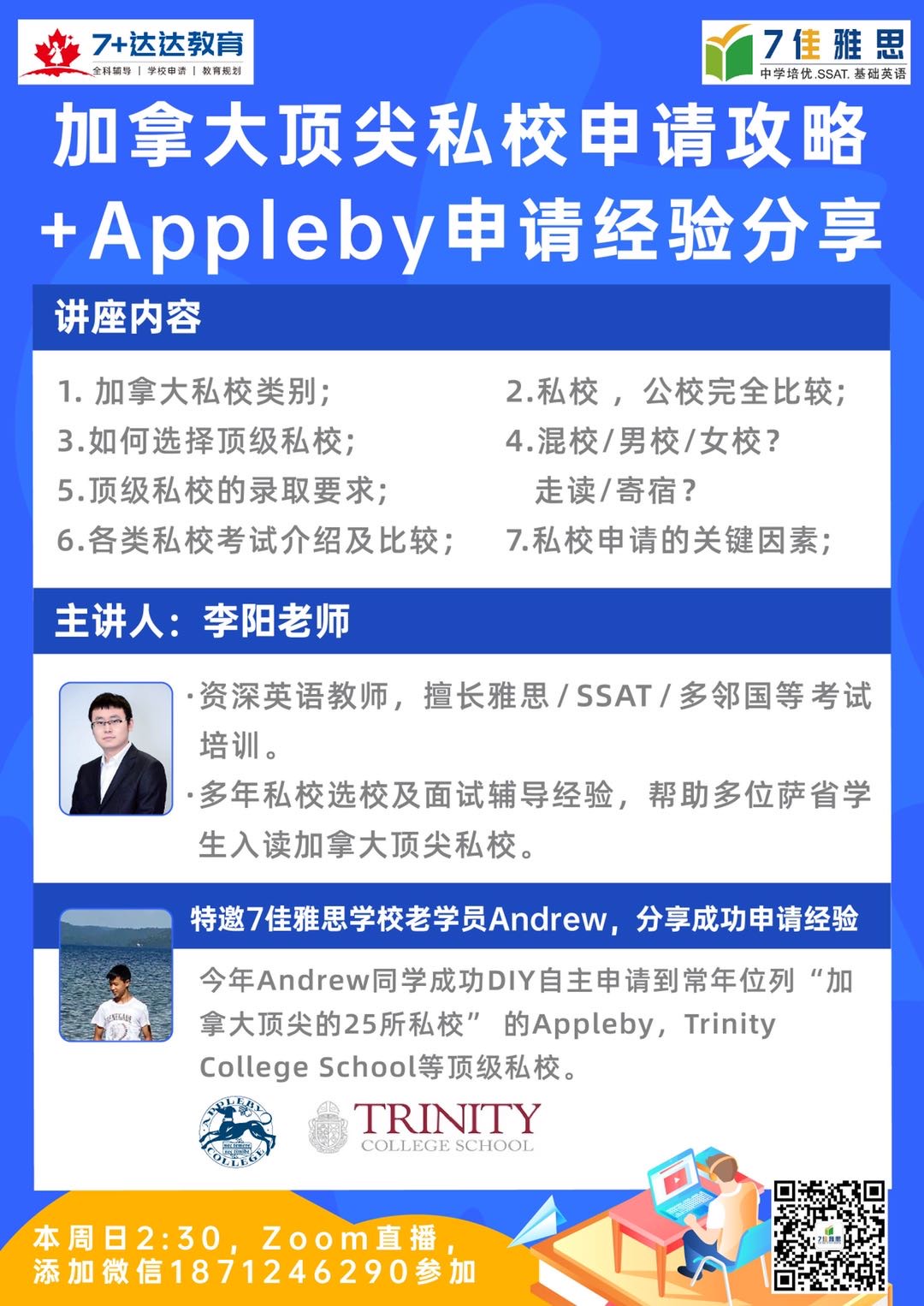 加拿大顶尖私校申请全面分析+ 顶私学长申请经历分享 1. 加拿大私校类别 2.私校 ,公校完全比较 3.如何选择顶级私校 4.混校/男校/女校?走读/寄宿? 5.顶级私校的录取要求 6.各类私校考试介绍及比较 7.私校申请的关键因素 主讲:李阳老师 7佳雅思学校创办人,多年私校选校及面试,考试辅导经验,帮助多位萨省学生入读加拿大顶尖私校。 🎉特邀7佳雅思学校老学员Andrew,分享顶私申请成功经验。 今年Andrew同学成功DIY自主申请到常年位列“加拿大顶尖的25所私校” 的Appleby,Trinity等顶级私校 时间:本周日2:30,Zoom直播,添加微信1871246290参加
