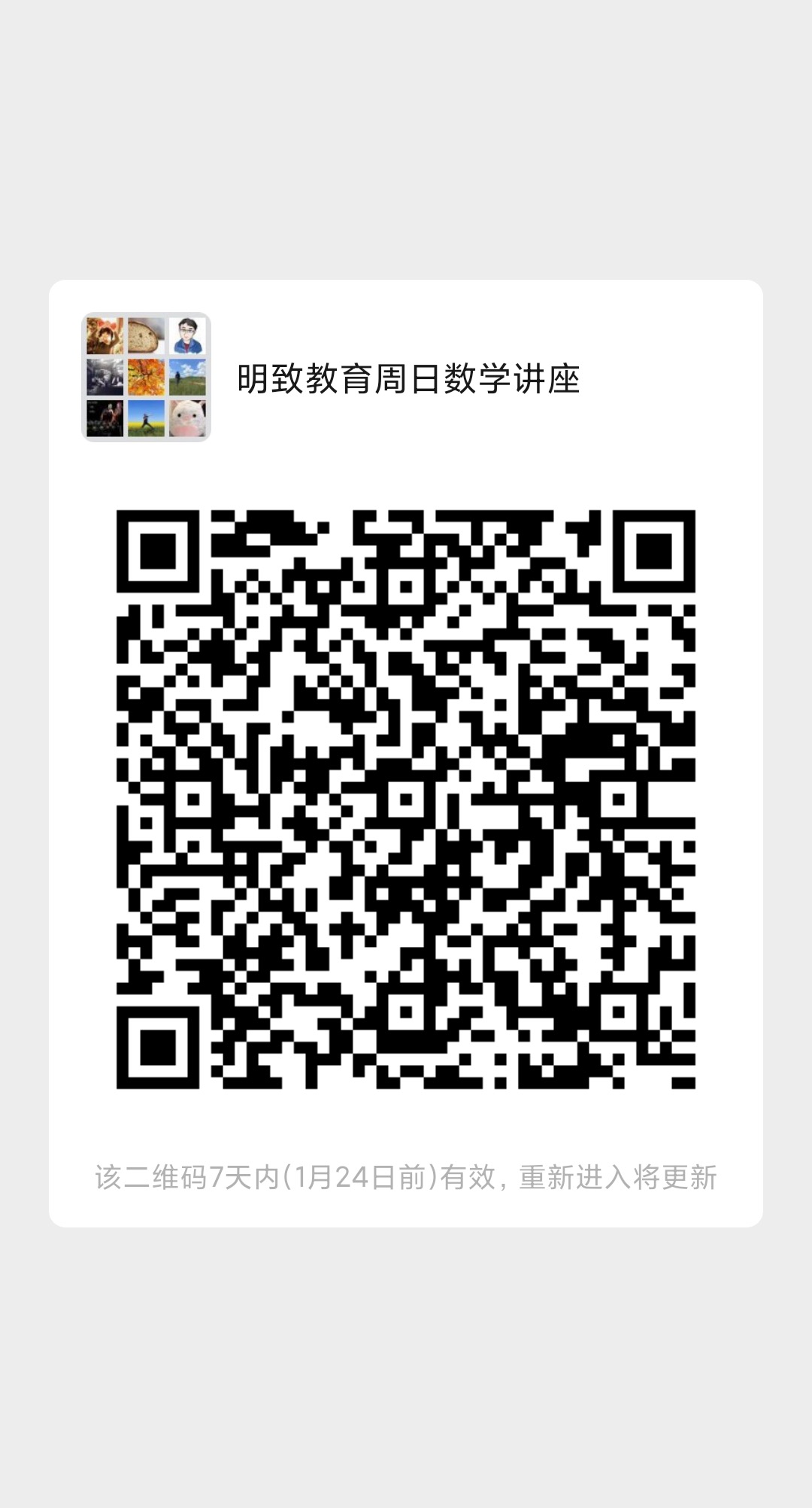 1. 数学教学本地化:中加数学教学到底有啥区别? 2. 数学学习纵览:给每个年级学子的建议; 3. 加拿大数学竞赛:数学竞赛都有啥?参加竞赛对孩子有啥帮助? 讲座时间:1月17日(周日)下午5:00-6:30 讲座地点:Zoom线上平台 扫码明致内部群免费听哦!