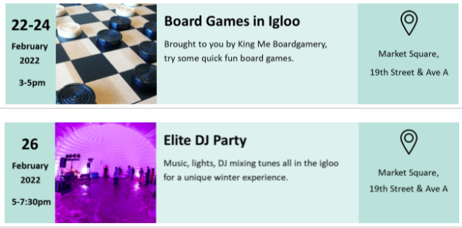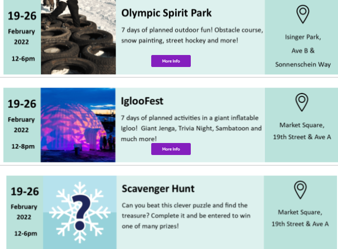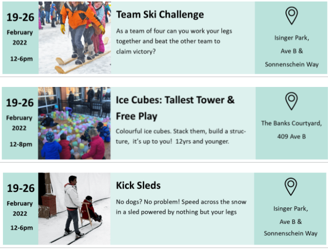 奥林匹克精神公园:来参观最酷的冬季公园!免费体验奥运主题活动。欢迎所有年龄段的人在 2 月 19 日至 2 月 26 日期间在位于 Ave B 和 Sonnenschein Way 拐角处的 Isinger Park为期 7 天的户外活动。