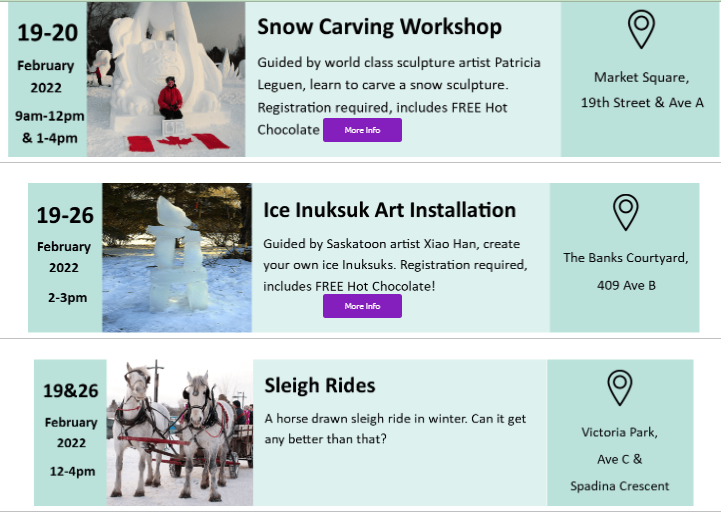 雪雕雕塑工作坊以“奥林匹克精神”为主题,由萨斯卡通当地的雕塑艺术家 Patricia Leguen 教授!与小组合作,在 Patricia 的指导下雕刻雪雕。需要注册才能参加研讨会,并成为 WinterShines 最具吸引力的活动之一!所有工作坊都将在 Market Square – Avenue A 和 19th Street 举行。