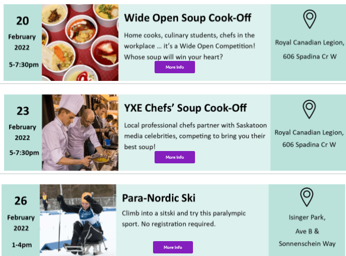 #YXE Chefs Soup Cook-Off:2022 年 2 月 23 日星期三下午 5:00 至晚上 7:30,地点在加拿大皇家军团大厅 – 606 Spadina Crescent W,萨斯卡通。他们当地的专业厨师协会成员与萨斯卡通媒体名人合作,为您带来最好的汤!活动期间在线投票选出你最喜欢的汤。