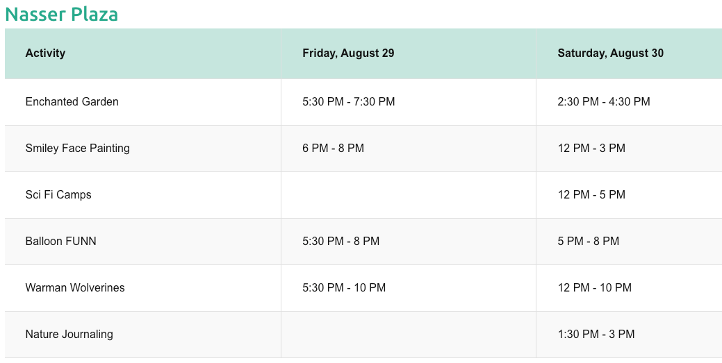 节日将在 River Landing, Nasser Plaza and Rotary Park举行!娱乐活动和景点将于8月39日周五下午 5:30 和8月30日周六下午 1:00 在 Rotary Park 和 圆形剧场舞台上演。烟花表演定于每晚 9:30 进行。
