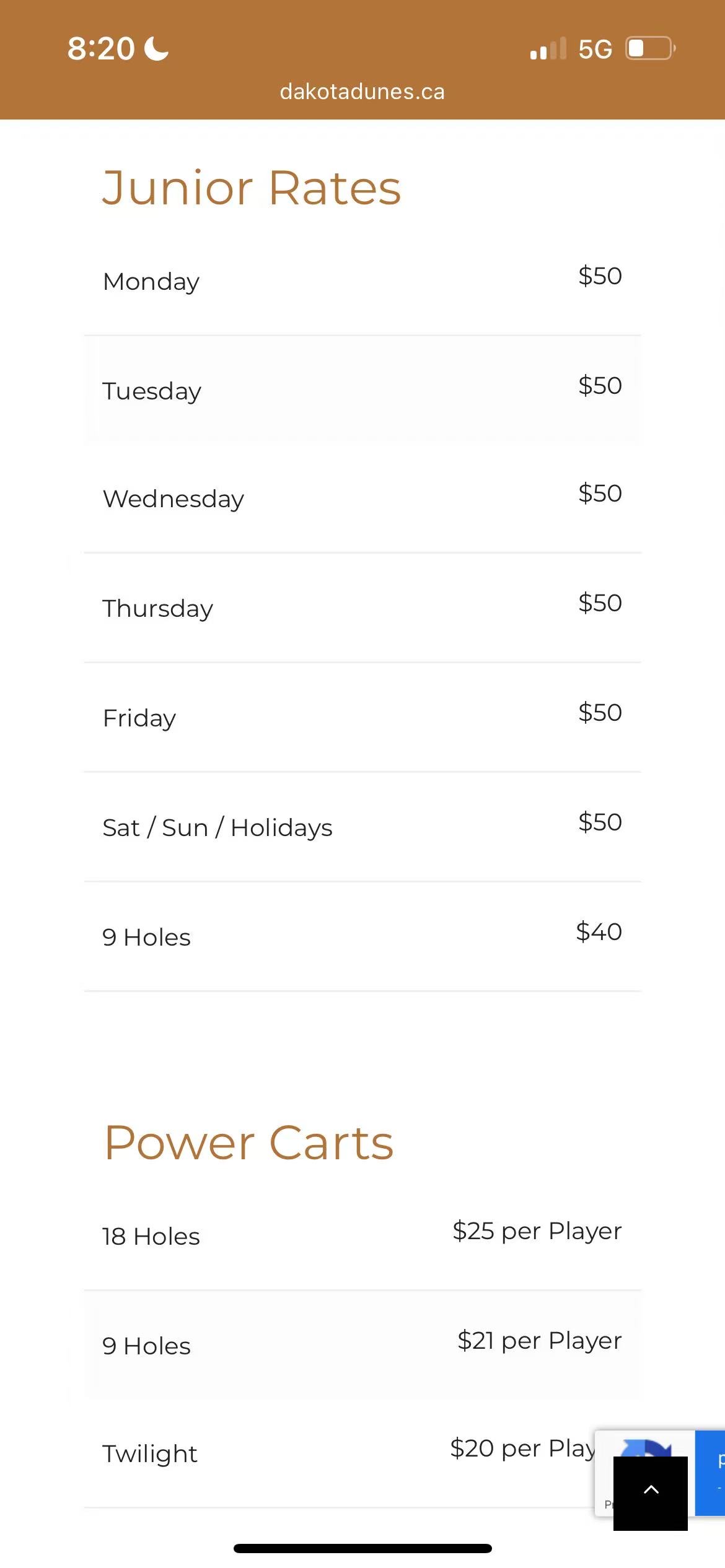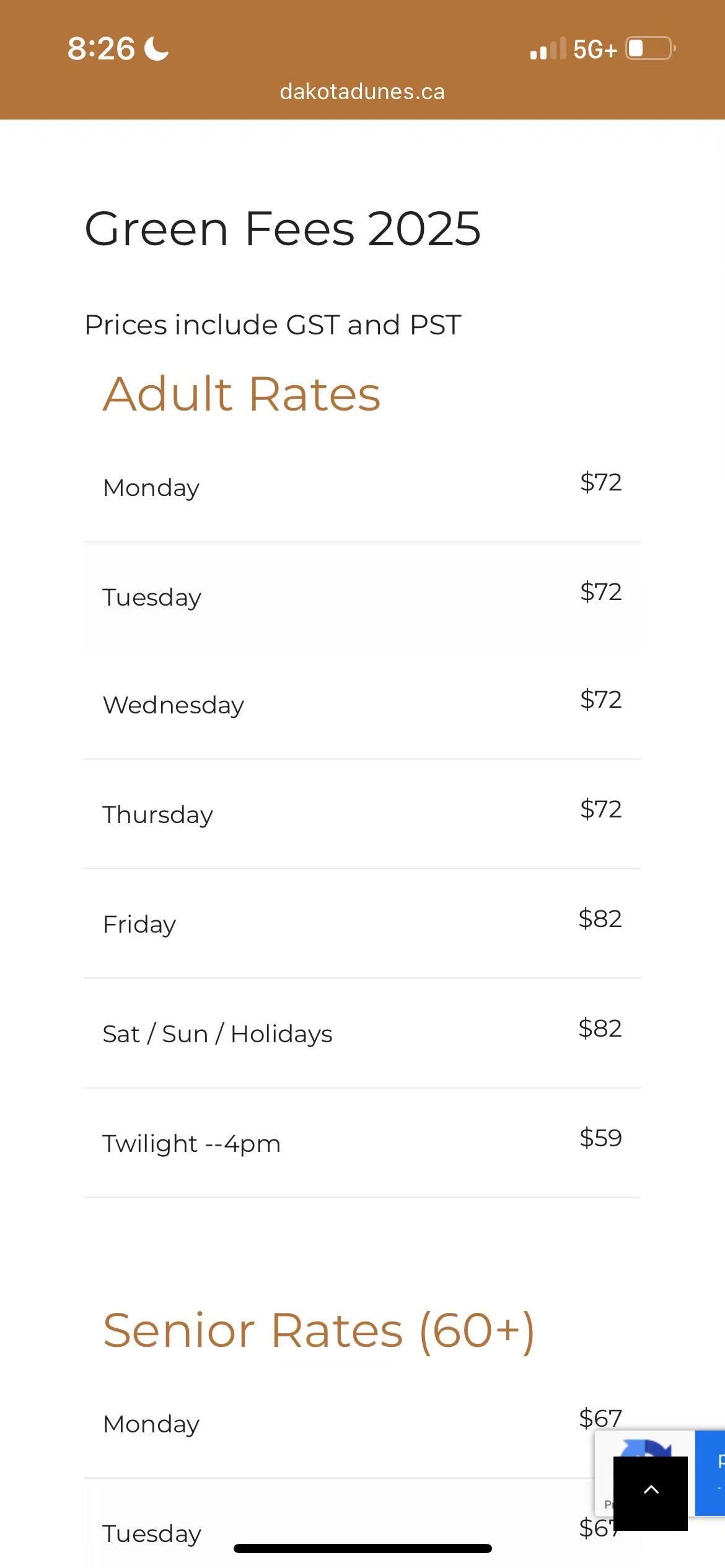 五、赛程安排 1、9月21日上午8:30~9:00为第2~第9组(男子组)报到时间,9:00~9:30为第10~15组报到时间,报到时缴纳下场费(现金)、领取“能量包”和“颁奖典礼就餐券”; 2、俱乐部日常周末价格为成人$107、未成年$75(含车含税,见下图),现与球场协商并由主赞助商进行税金补贴后下场费为成人$85、未成年$60,并且球场免除了所有练习场的球费,平日是$9/筐;