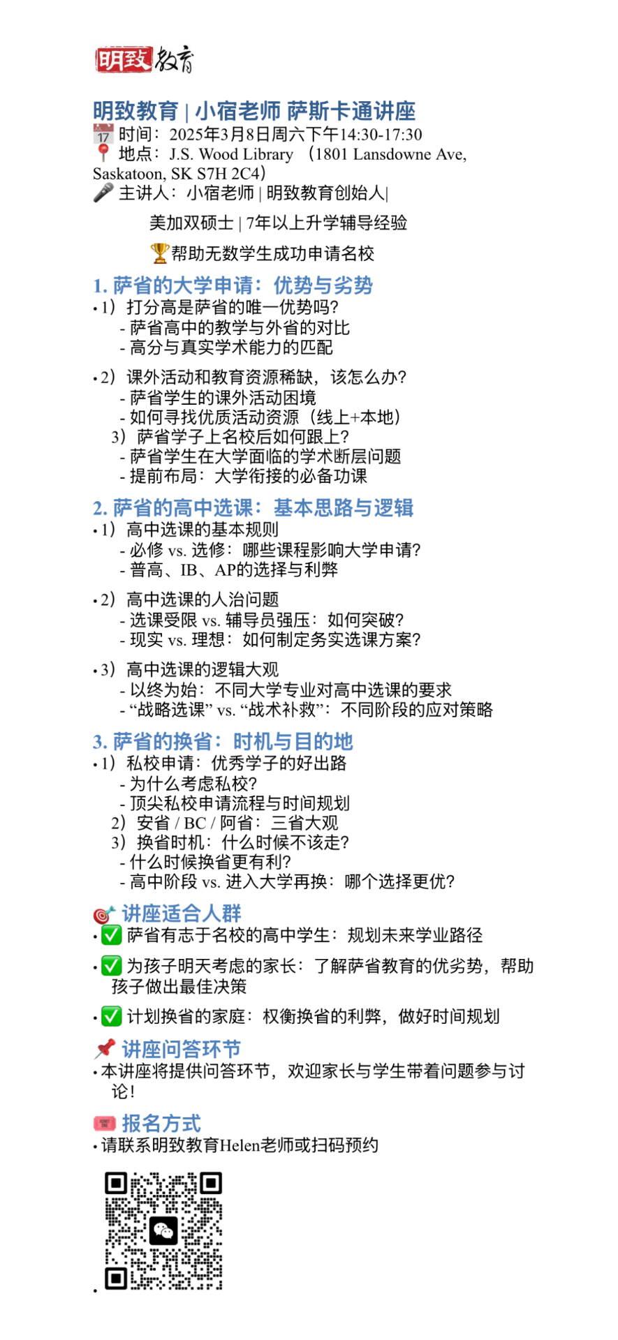 由于近来“萨省高中选课/换省规划”咨询的家长和孩子们特别多,因此应大家的强烈要求,明致教育小宿老师于2025年3月8日(周六)亲临萨斯卡通,带来重磅公益免费讲座,具体内容如下图👇