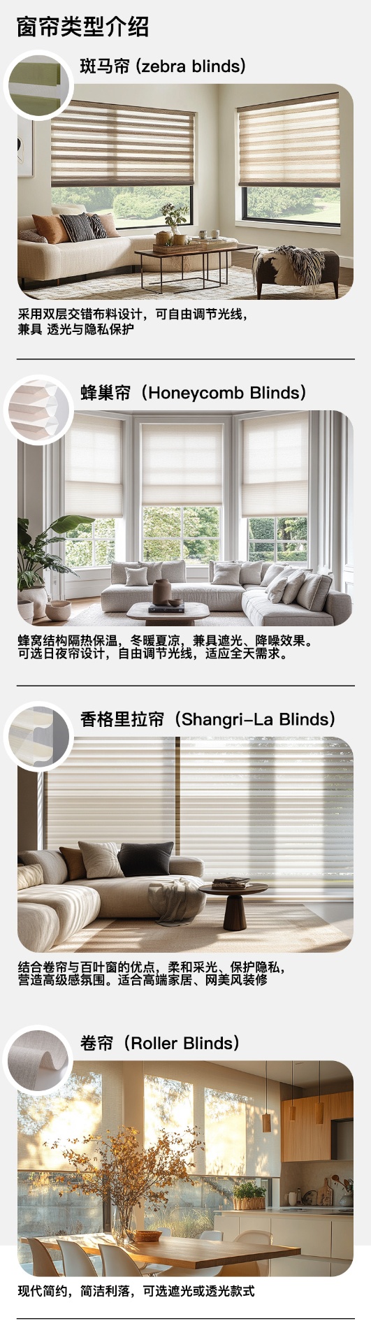 🎯 多种款式 —— 提供 卷帘、斑马帘、蜂巢帘、透光帘 等多种选择,可选 手拉或电动,满足不同需求。