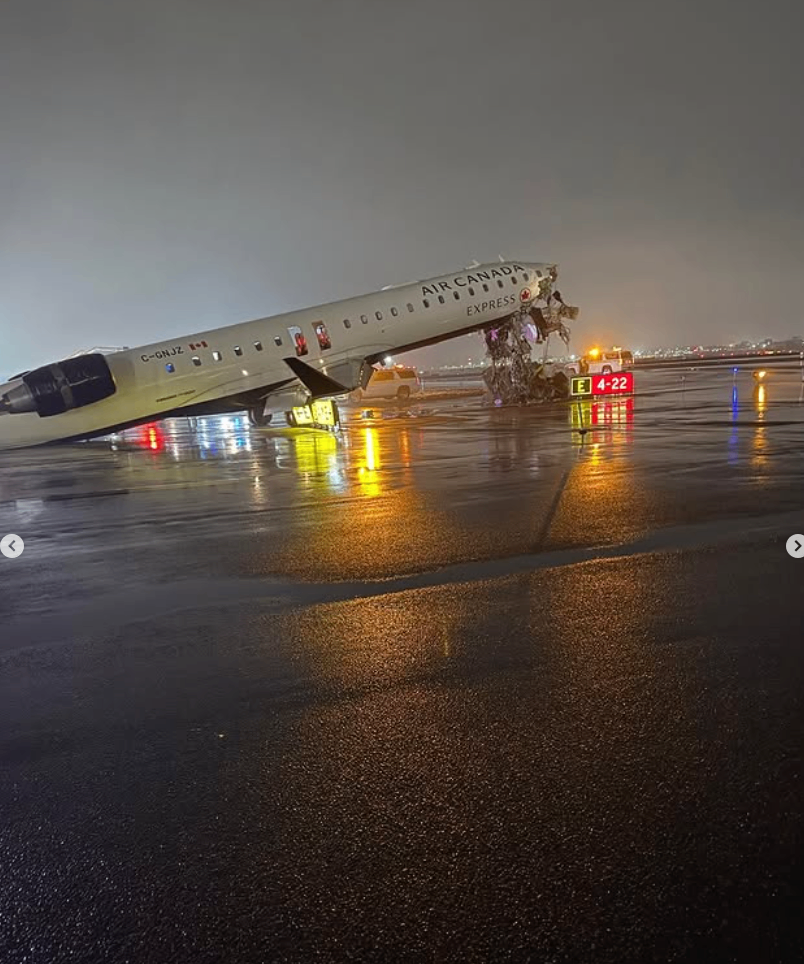 当晚11点30分刚过,一架已获绿色信号允许降落的加拿大航空快运(Air Canada Express)客机撞上了一辆获准穿越跑道的消防车,造成两名年轻加拿大飞行员死亡,另有41人被送往医院。