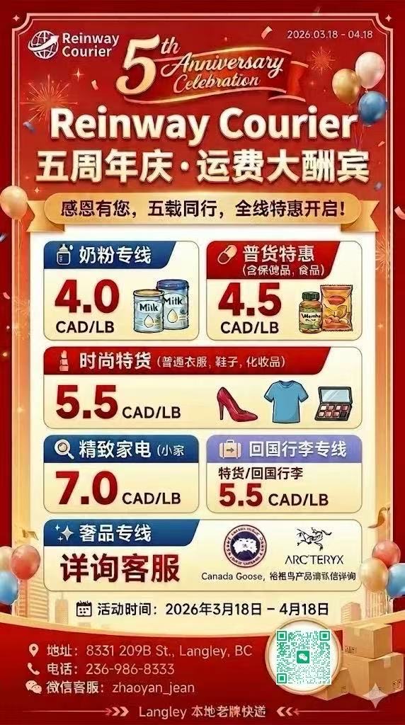 公司为庆祝成立五周年,自2026年3月18日开展优惠运费活动,活动期间运费如下:奶粉类(不含水奶)4元/每磅,普通保健及食品4.5元/磅,(200元以内)普通品牌衣鞋类及普通化妆品(Costco)5.5元/磅,小电器7元/磅,以上产品均2磅起邮。回国行李5.5元/磅。免费代买costco, Walmart 等超市产品,也可自行购买后邮寄上面地址代发,具体装箱规则及大鹅,始祖鸟等品牌欢迎来电垂询。